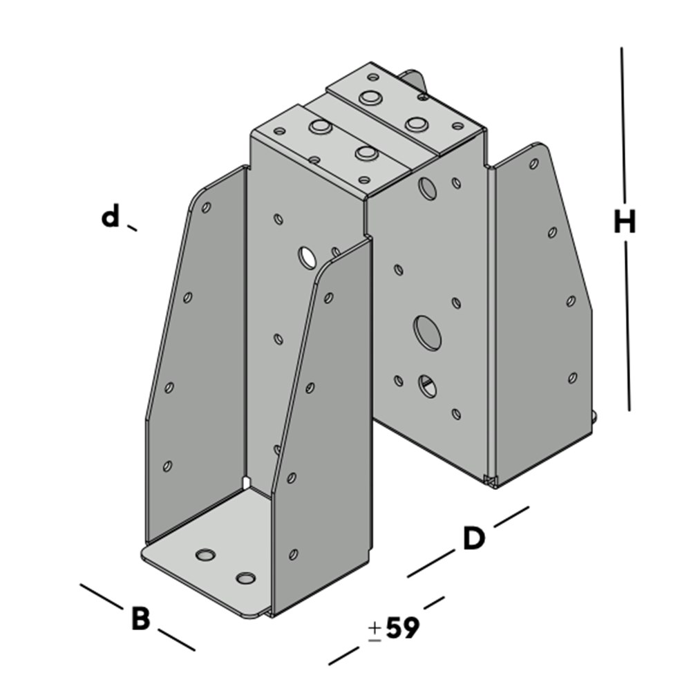 Dubbele balkdrager, die over een moerbalk of hoofdraveelbalk wordt gehangen en vervolgens aan weerszijden in de rug van elke balkschoen wordt bevestigd zodat aan elke kant een dwarsbalk verbonden kan worden. Dit product wordt geleverd op bestelspecificatie ten aanzien van de afstand tussen de balkschoenen (dikte van de moerbalk) en is beschikbaar voor de gangbare kopmaten van geschaafd of ongeschaafd balkhout.