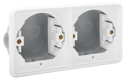 Deze tweevoudige horizontale montagedoos is geschikt voor het inbouwen van twee spuitwaterdichte functies. Het geheel is spuitwaterdicht wat het uitermate geschikt maakt voor gebruik in vochtige ruimtes en ammoniakrijke omgevingen. Afwerkingskleur: wit.