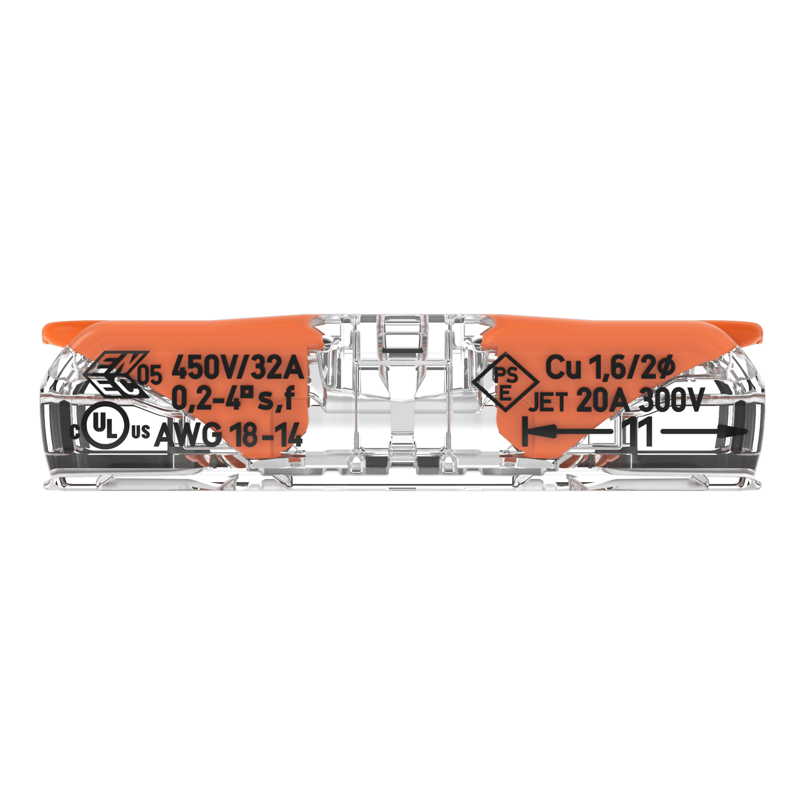 Wago 221 Compact lasklem, kleurloos, nom. doorsnede 0.2 - 4mm², geschikt voor soepele ader, met bedieningshendeltjes, 2 klemposities, nom. stroom 32A, aderdoorsnede massieve draad 0.2 - 4mm², aderdoorsnede soepel met huls 0.2 - 4mm², AWG-bereik 14 - 18, geschikt voor massieve ader.