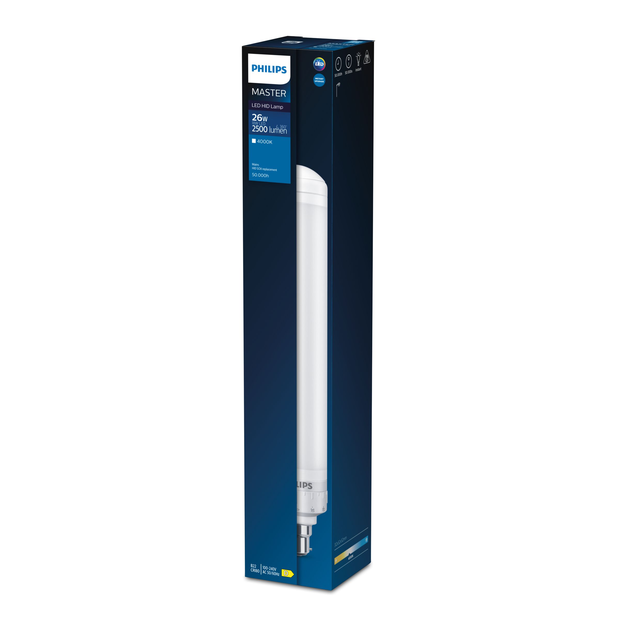 Philips TrueForce LED SOX led-lamp, wit, lengte 312mm, diameter 52mm, temperatuur 4000K, voet B22d, 18W, lichtstroom 2500lm, lampvorm overig, nom. spanning 100 - 240V, stralingshoek 230°, uitvoering glas/afdekking helder, spanningstype AC, beschermingsgraad (IP) IP40, weergave-index 80 - 89.