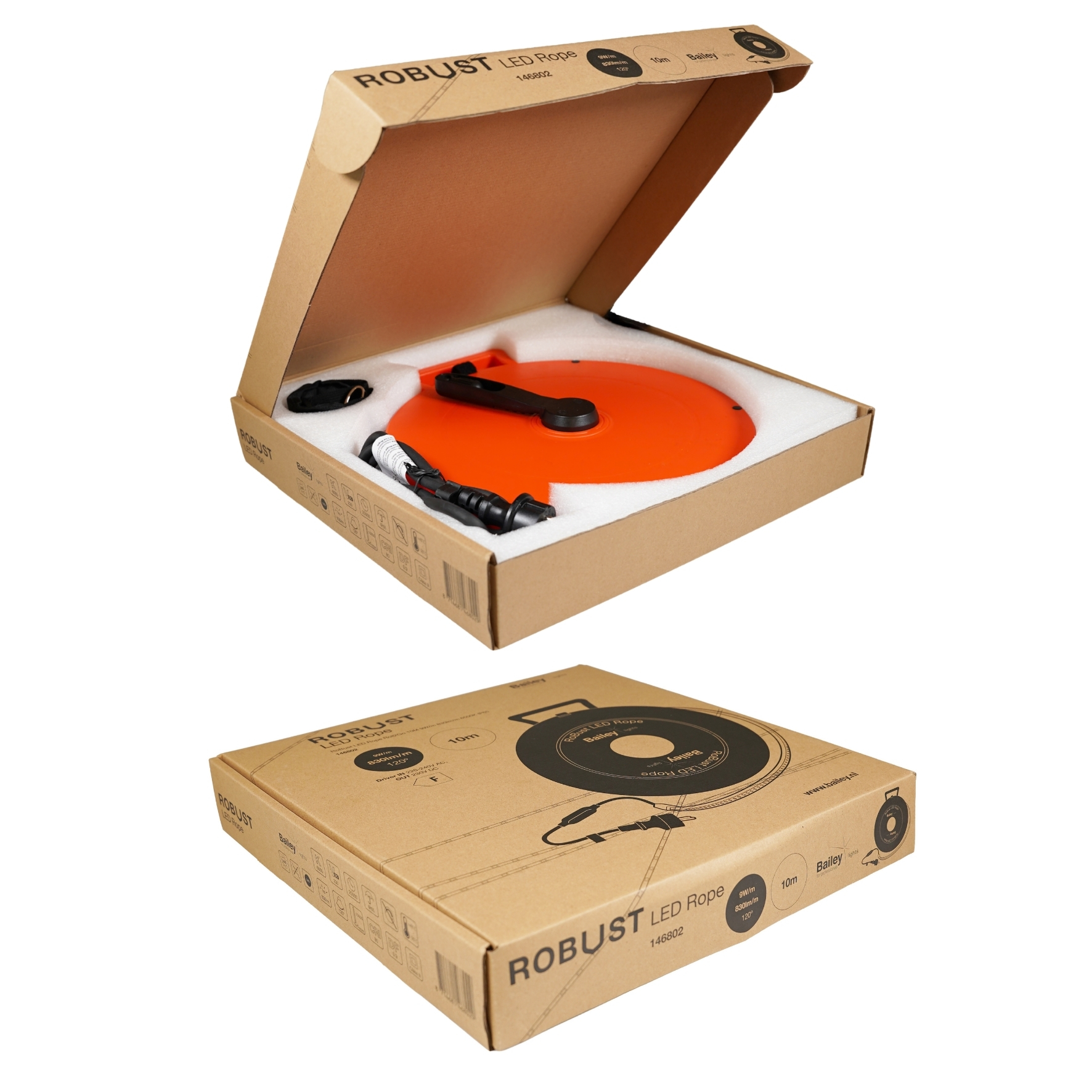 De Robust LED Rope Roll2Go maakt deel uit van de Bailey Robust serie. Het is een robuste lichtslang van 10 meter bedoeld om bouwplaatsen, kruipruimtes en werven te verlichten en de loop- en werkpaden te beveiligen. Deze Klasse II lichtslang is waterbestendig (IP65) en kan tegen een stootje (IK10) doordat hij in PVC is gegoten. Met 120 leds per meter (830 lm/mtr) geeft de Rope 120˚ “cool white” werklicht (6500K) af. Kan gelijk aangesloten worden op het net (Plug&play). De Roll2Go wordt geleverd in een platte mobiele oprolcassette met een draaihandvat. Hierdoor zeer eenvoudig af- en op te rollen terwijl hij bijvoorbeeld met de meegeleverd band aan een steiger hangt. Geschikt voor omgevingstemperatuur van -20°C tot +40°C. Niet in te korten of te verlengen. Rol ALTIJD eerst de slang af voor de stekker in het stopcontact te steken. Na gebruik LED Rope eerst af laten koelen voordat je hem weer oprolt in de cassette. De Rope zet namelijk uit en dit kan het draaimechanisme beschadigen.