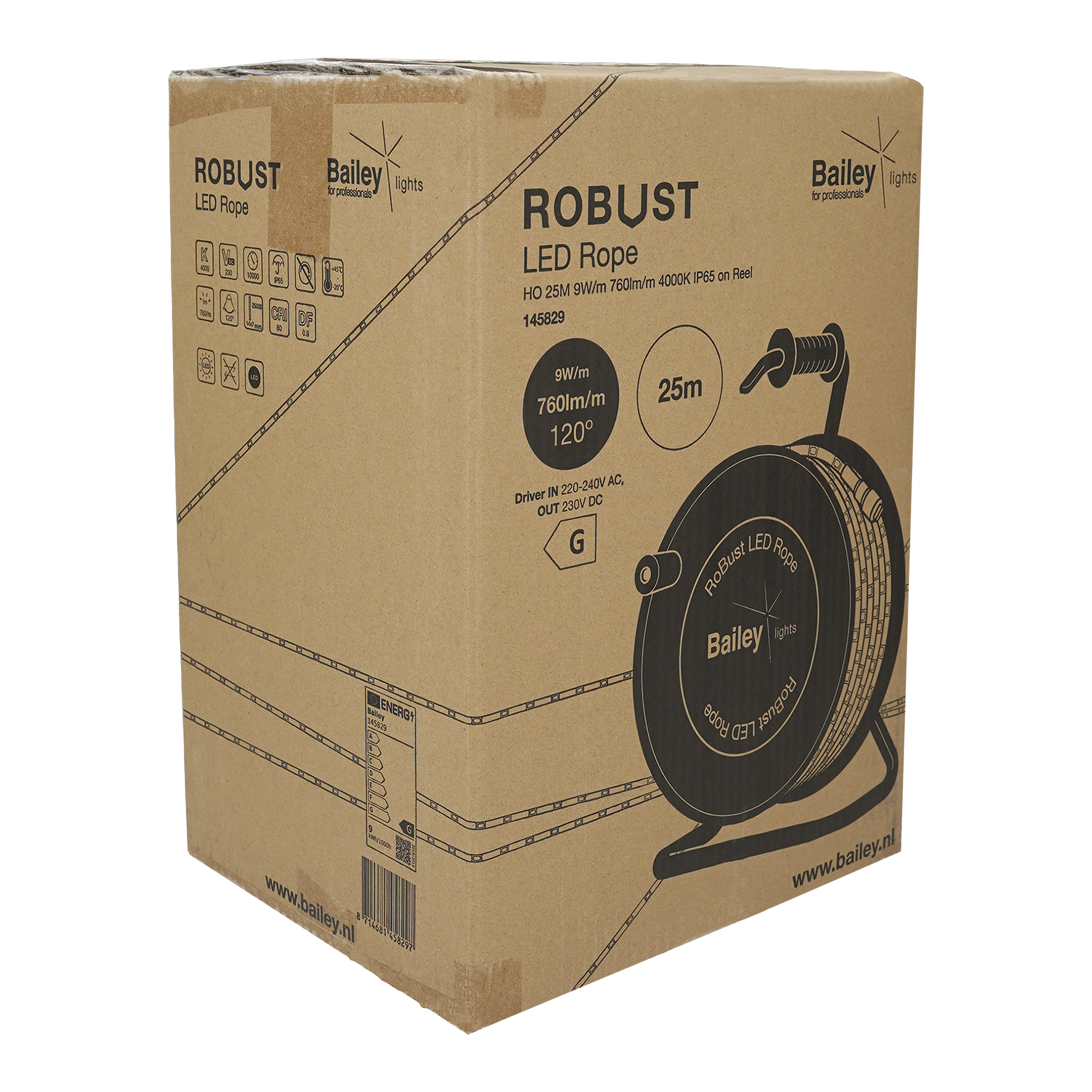 De Robust LED Rope HO maakt deel uit van de Bailey Robust werkverlichting serie. Het is een robuste lichtslang van maar liefst 25 meter bedoeld om bouwplaatsen, kruipruimtes en werven te verlichten en de loop- en werkpaden te beveiligen. Deze Klasse II lichtslang is waterbestendig (IP65) en kan tegen een stootje doordat hij in silicone is gegoten. Met 60 leds per meter (760 lumen per meter) geeft de Rope 120Ëš koud licht (4000K) af. Wordt geleverd op een haspel zodat hij makkelijk is mee te nemen na elke klus. Deze Robust is simpel te koppelen en wordt geleverd met een 230V voeding met een ingebouwde AC/DC adapter en voedingskabel van 1,5 meter. Eventuele bevestigingsclips beschikbaar (artikel 145830). De Rope is eenvoudig in te korten door gebruikmaking van standaard PVC-lijm (niet meegeleverd) en eindkapje (ook extra los te verkrijgen met artikelnummer 145831). LET OP: LED Rope nooit laten branden op de haspel, altijd in zijn geheel afrollen voor gebruik.
