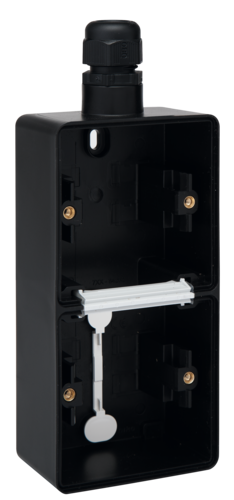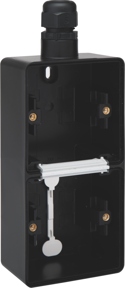 Spuitwaterdichte dubbele verticale opbouwdoos met één M20-ingang met wartel voor het inbouwen van twee functies, black. De bevestigingspunten bevinden zich 120 mm uit elkaar op een verticale as. Deze maataanduiding bevindt zich onuitwisbaar op de bodem van elke doos. De ovale schroefopeningen laten toe een onnauwkeurige boring op te vangen. Een afdichting waarborgt, door een persborging, de beschermingsgraad en de dubbele isolatie. De doos beschikt over twee diagonaal uitbreekbare condensatieopeningen. De opbouwdoos is vervaardigd uit slagvast, stofwerend, halogeenvrij en zelfdovend polypropyleen (UL94-V2/1,6 mm).