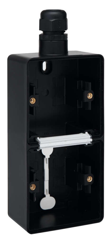 Deze dubbele verticale opbouwdoos met één M20-ingang met wartel is geschikt voor het inbouwen van twee functies. Het geheel is spuitwaterdicht wat het uitermate geschikt maakt voor gebruik in vochtige ruimtes en veeleisende omgevingen. Afwerkingskleur: black.