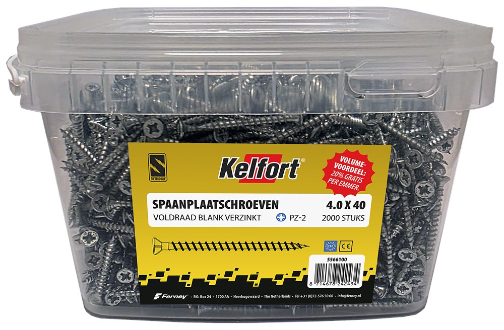 Het assortiment spaanplaatschroeven is breed en biedt een uitstekende dekking. Daarnaast werkt de schroef tijdbesparend. Door de toepassing van slechts 3 Pozi-uitvoeringen hoeft er namelijk minder snel van bit te worden gewisseld. De Silverdrill schroef is verpakt in een stevige doos, voorzien van een kiepklep en kijkvenster. Ook is de nieuwe Kelfort schroef ETA gekeurd en voorzien van een CE-markering.