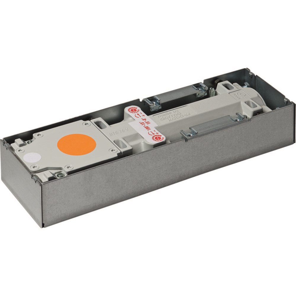 (sluitmoment ca. 10 - 30 Nm), korrosieklasse 4, voor DIN linkse-, DIN rechtse- en dubbel werkende deuren, met sluitwerking vanaf ca. 175º. Methydraulisch volledig controleerbaar sluitverloop, instelbare sluitsnelheid in twee onafhankelijke sektoren (175º- 15º/ 15º- 0º) en openingsdemping. Met instelbare dekplaatbevestiging aan cementkast. Geschikt voor deuren tot een gewicht van 120 Kg en een breedte van < 1100 mm. Vloerveer wordt bevestigd in de cementkast door stelschroeven, welke vast worden gedraaid aan binnenzijde van deze cementkast (Klembevestiging).