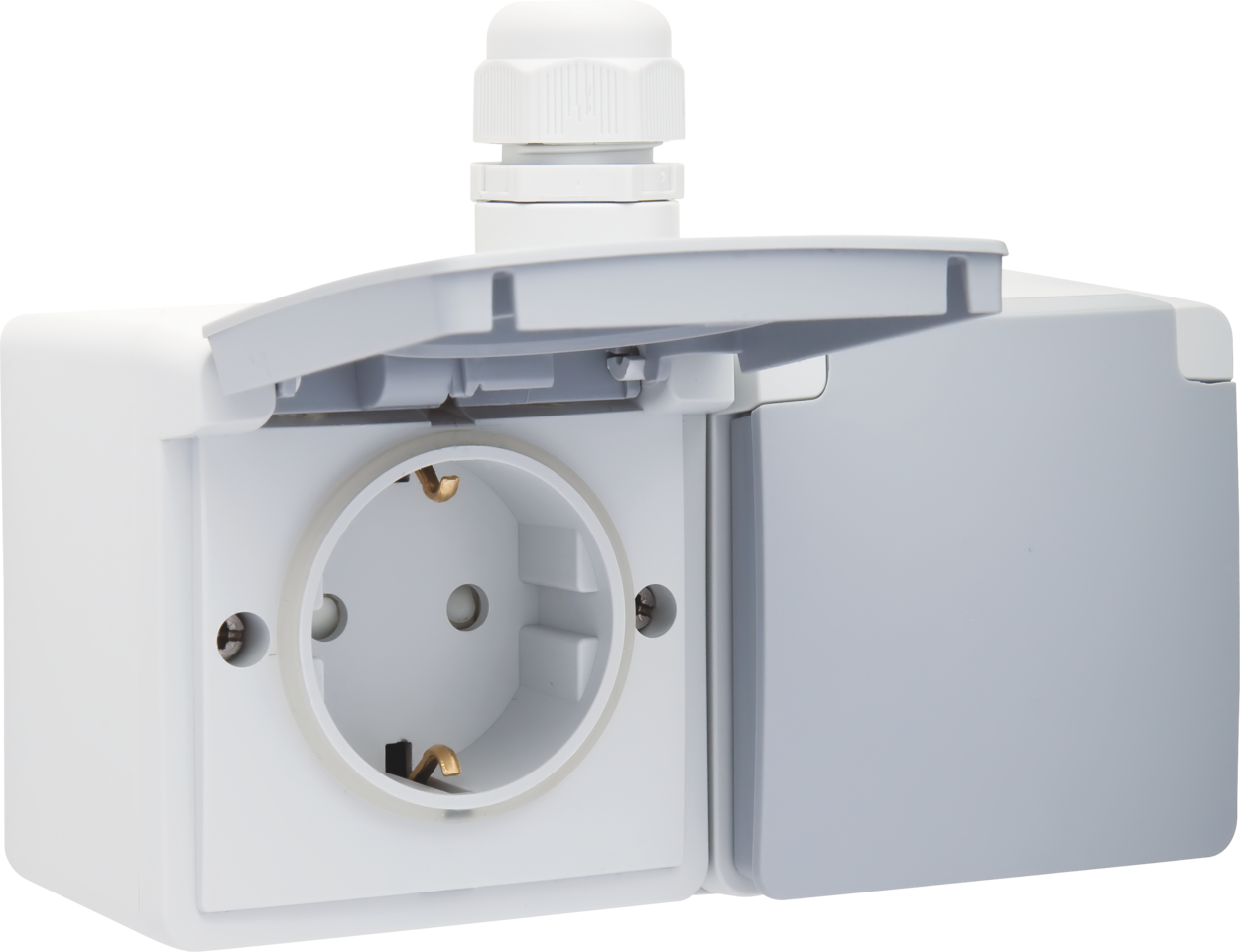 Bij deze horizontale combinatie zijn de twee spuitwaterdichte stopcontacten voorzien van randaarde, beschermingsafsluiters en schroefklemmen. Beide stopcontacten zijn eveneens voorzien van een beschermklep met scharnieren en zijn voorbedraad (2,5 mm²) en gemonteerd in een dubbele spuitwaterdichte opbouwdoos met één M20-ingang met wartel. Het geheel is spuitwaterdicht wat het uitermate geschikt maakt voor gebruik in vochtige ruimtes en ammoniakrijke omgevingen. Kleurcombinatie: lichtgrijs met donkergrijze beschermklep.